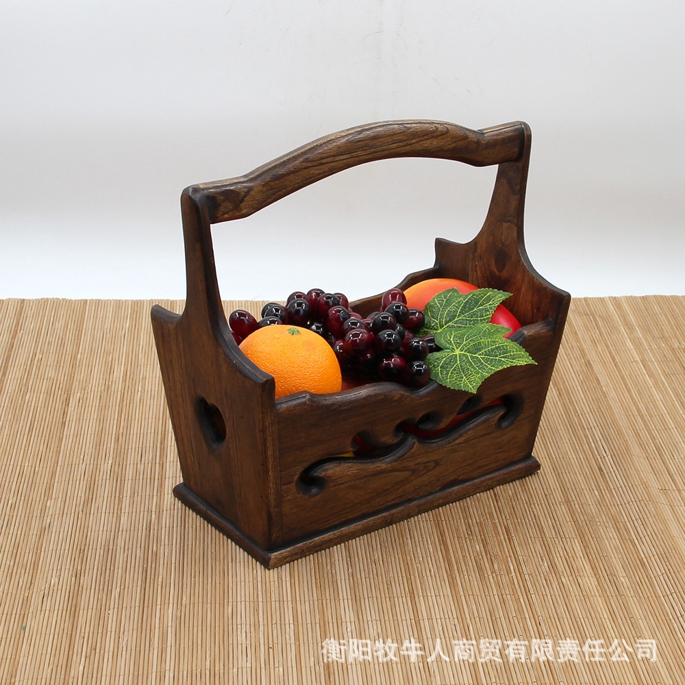 Wood Carved Vintage Storage Basket With Hanging Carved Fruit And