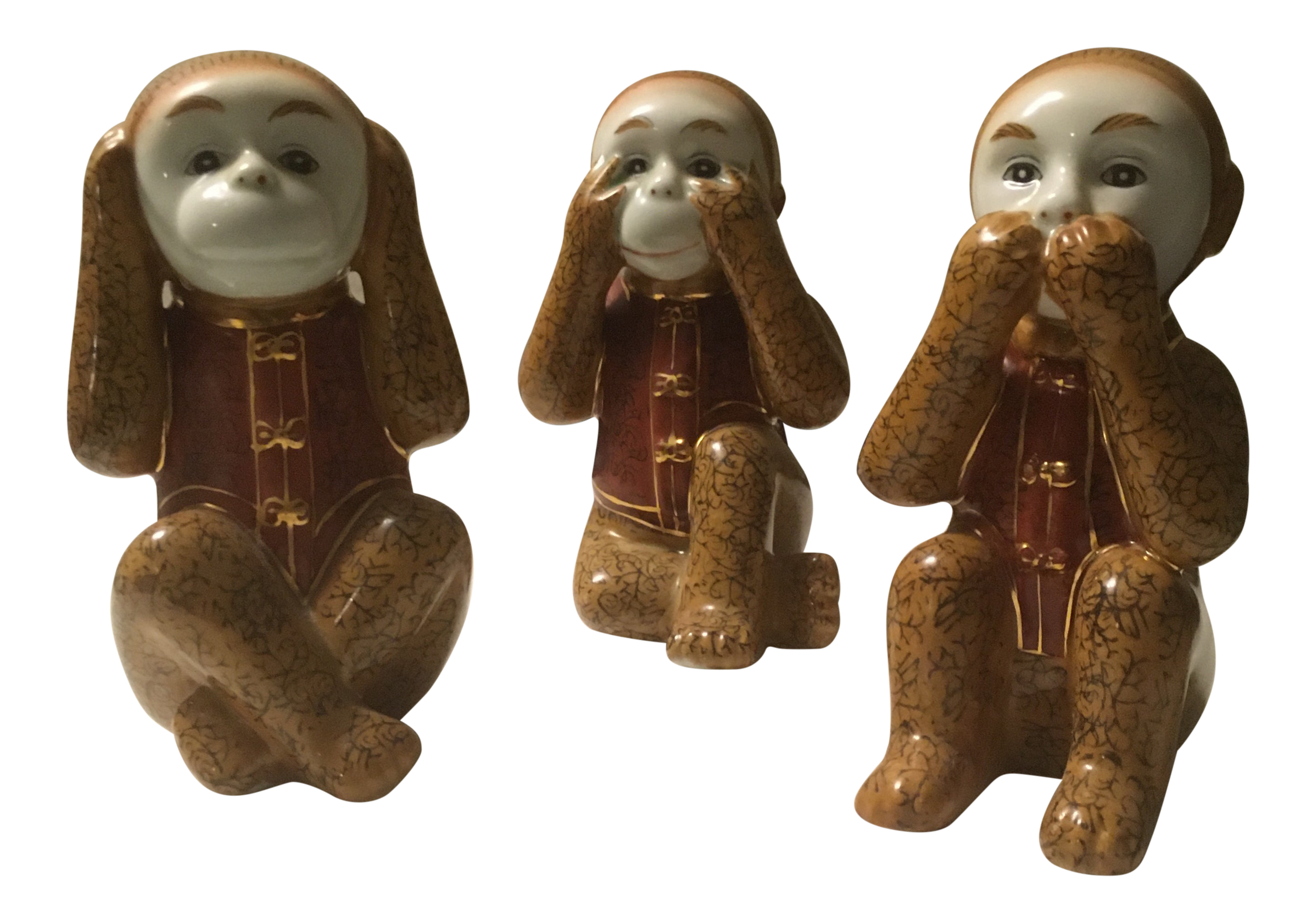 Chinoiserie Hear See Speak No Evil Porcelain Monkey Figurines