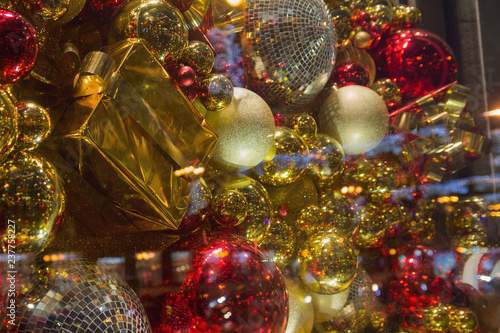 Christmas Decorations Gold Balls Toys On A Shelf In Shop Market