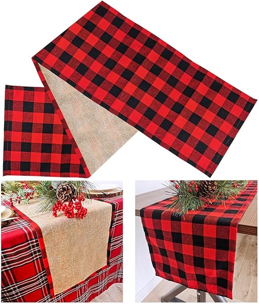 Christmas Table Runner Burlap Cotton Red Black Plaid Reversible