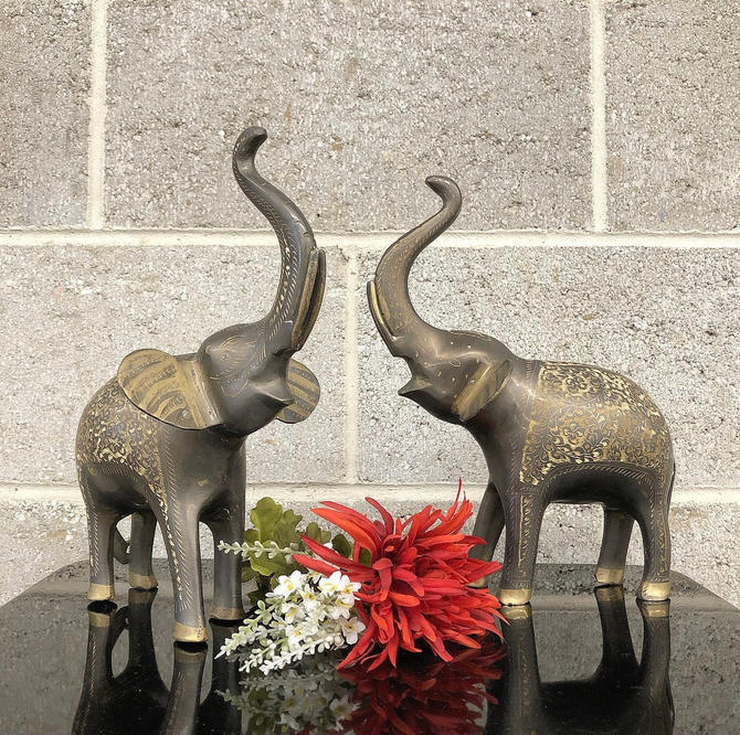 Vintage Brass Elephants 1960s Set Of 2 Hollow Body Etched