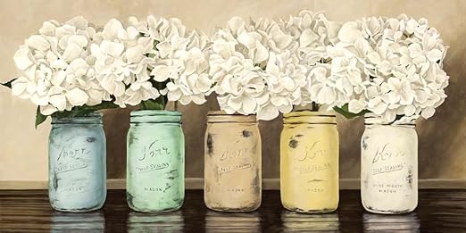 Amazon Com Hydrangeas In Mason Jars By Jenny Thomlinson Art Print
