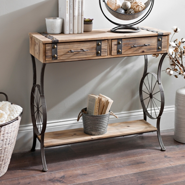 Industrial console and sofa tables incorporate a modern look and metal wheels fit right into this style. 1 42 46 in. Industrial black metal wheels and wood console table by brimfield may 179 very unique and the epitome of industrial style this wood console has a multi toned natural wood grain tabletop perched above 2 large metal wheels secured to a wood base the neutral and natural wood tones offer earthy texture while the black iron wheels bring. Find furniture decor you love at hayneedle where you can buy online while you explore our room designs and curated looks for tips ideas inspiration to help you along the way.