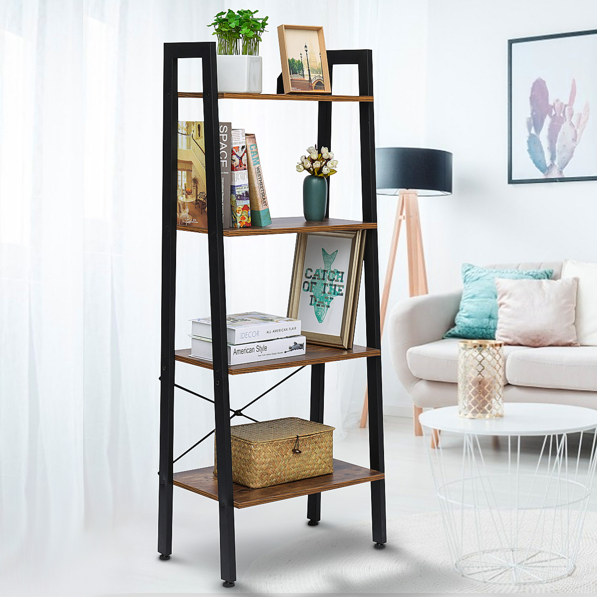 4 Tier Bookshelf Industrial Ladder Shelf Rustic Rack Wood Metal