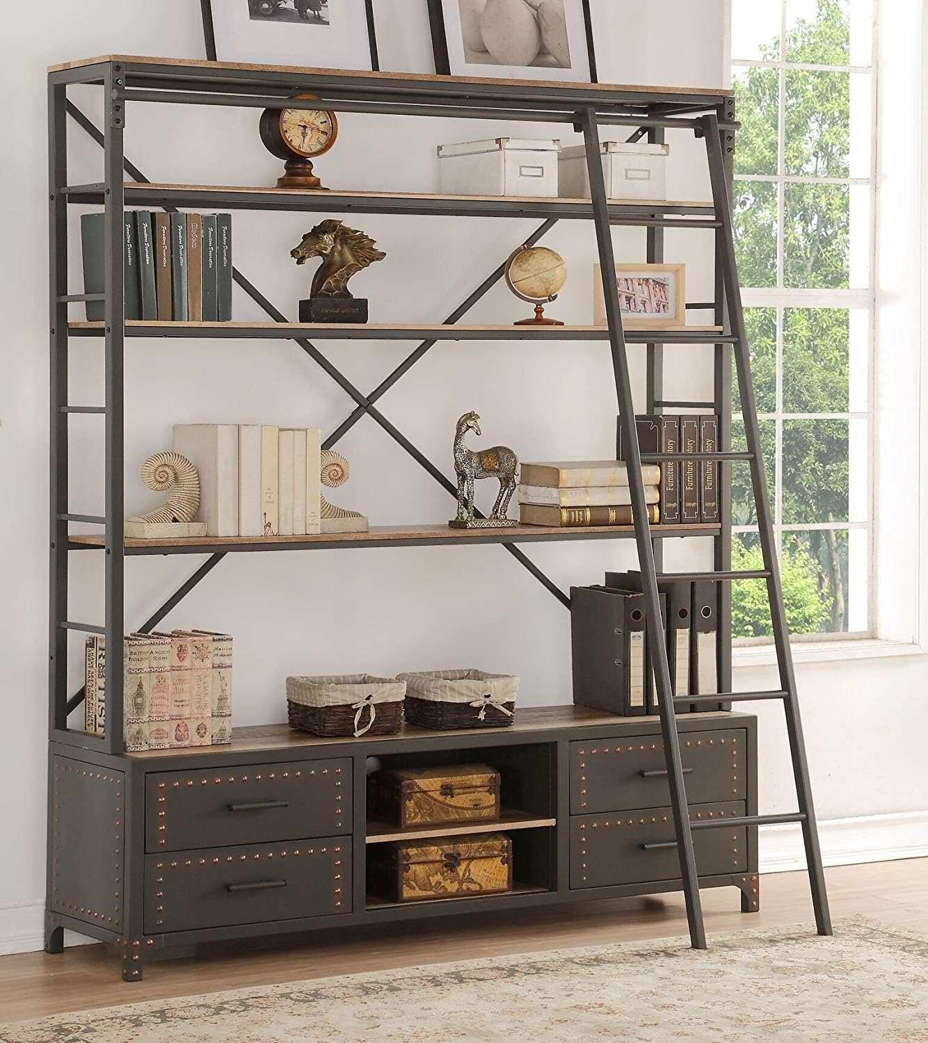 Industrial Style Wood And Iron Shelf With Ladder And Drawers