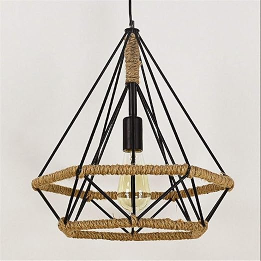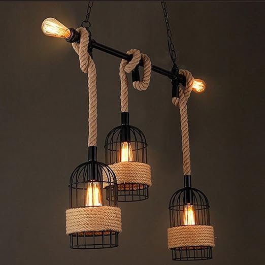Rustic Hemp Rope Pendant Light Iron Cage Chandelier Retro Hanging