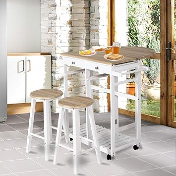 Amazon Com Ssline 3pcs Dining Table Set With 2 Pub Stools Mobile Kitchen Island Table With Drop Leaf Small Wooden