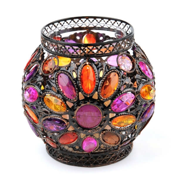 Jeweled Candle Holder Boho Blue Green Amber Gems Metal Globe