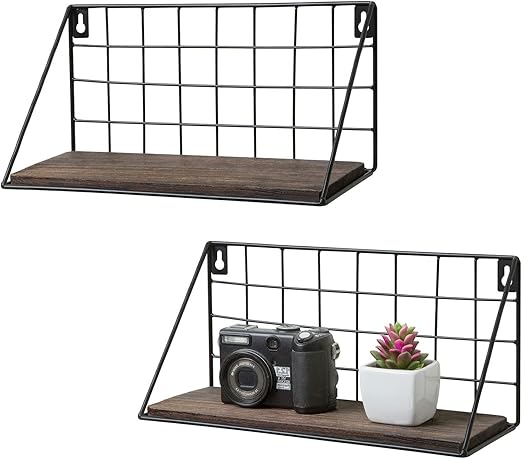 Amazon Com Mkono Set Of 2 Wall Floating Shelves Rustic Modern Wood Wall Storage Shelves With Metal Wire Display Shelf For Bedroom Living Room Bathroom Kitchen Office Brown Kitchen Dining