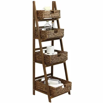 4 Tier Brown Wood Ladder Shelf W Woven Baskets Wald Imports