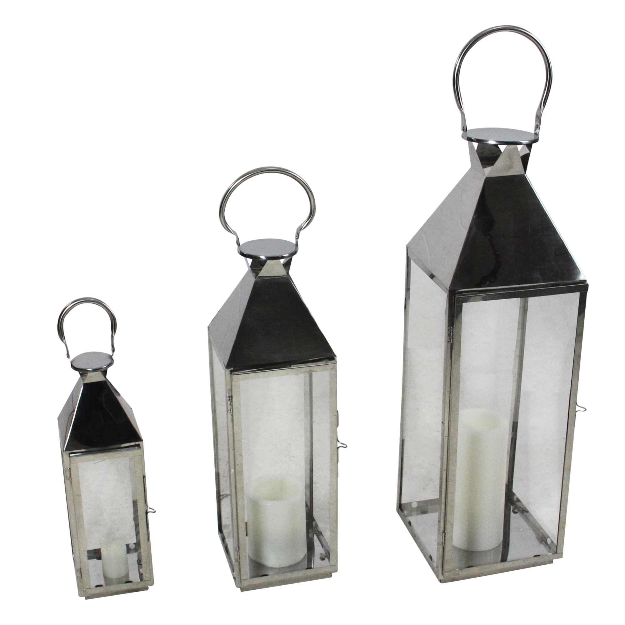 Set Of 3 Stainless Steel And Glass Pillar Candle Holder Lanterns