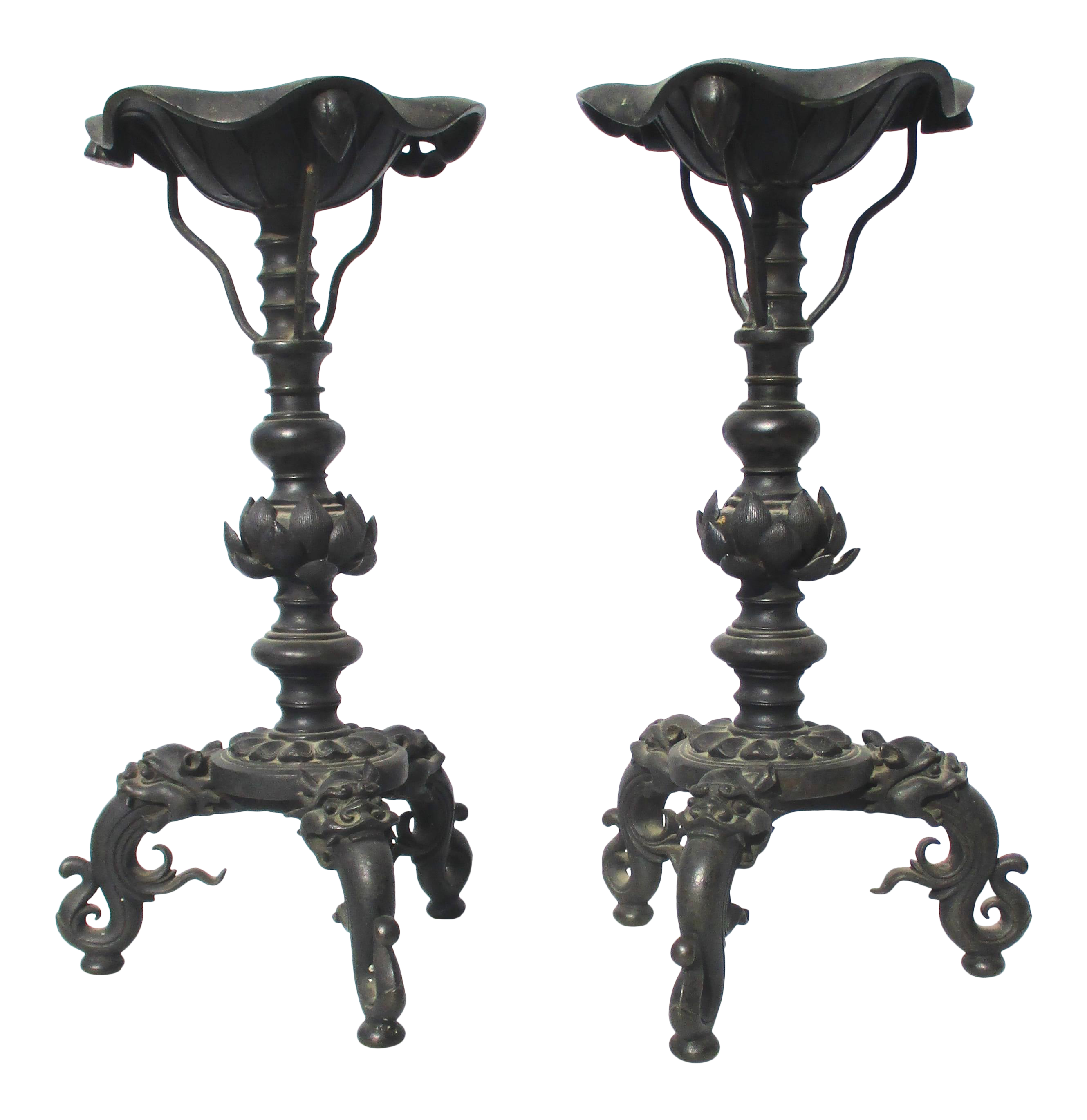 A Pair Of Large Bronze Candle Holders With Botanical Decors Dragons Elephant Heads And Water Lilies China Ming Dynasty Half Of The 17th Century The Art Of Himalayan And Chinese Bronze