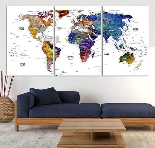 Amazon Com Detailed Watercolor World Map Wall Art By Sami Eymur 3 Piece Multi Panel X Large Hanging Canvas Print For Home Decor Track Your Travels With This Push Pin World Map